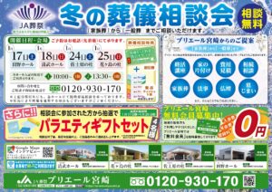 1月17日(土)・18日(日)・24日(土)・25日(日)の合計4日間、「冬の葬儀相談会」を各ホールにて開催いたします。葬儀に関する疑問やお悩みを少しでも解決してみませんか?
